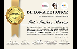Este es el tercer reconocimiento que logro en este año a nivel internacional. Un par de días antes del cierre de esta bienal, decidí enviar mi obra "Ellos tienen hambre", un tema que calzaba bien con el concepto del concurso el cual se enmarco en la Paz y Los Derechos Humanos. Sin saberlo, había quedado entre los 15 finalistas del concurso y más aun, supe por una colega que también había quedado ganador en el 4° lugar dek concurso.